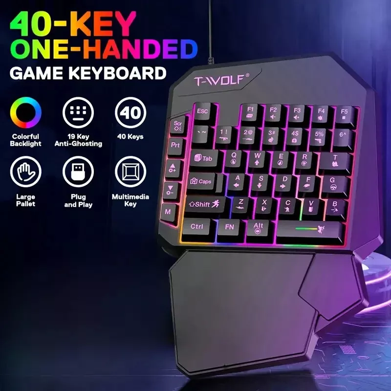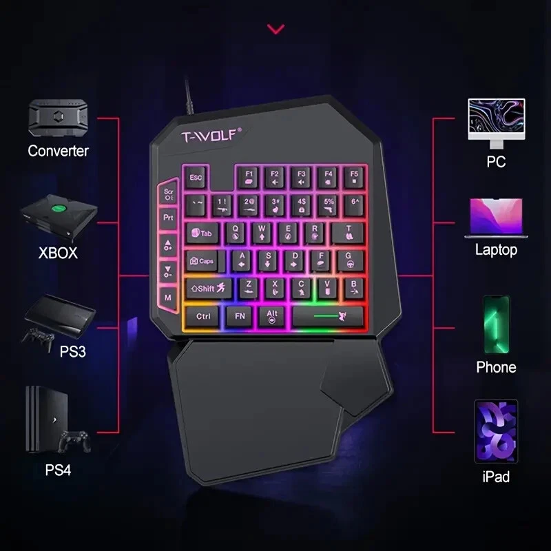 T-Wolf One-Handed RGB USB Gaming Keyboard – Ergonomic Gaming Keypad with Palm Rest