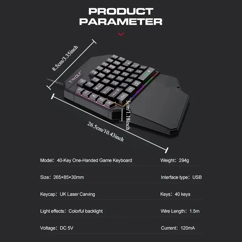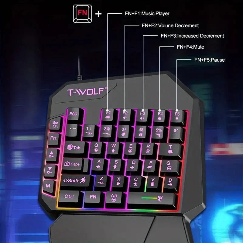 The T-Wolf One-Handed Gaming Keyboard features a full set of programmable keys and customizable RGB backlighting, allowing you to personalize your setup and highlight your most-used commands. Its ergonomic design with an integrated palm rest ensures long-lasting comfort during extended gaming sessions, reducing wrist strain while maintaining peak performance.